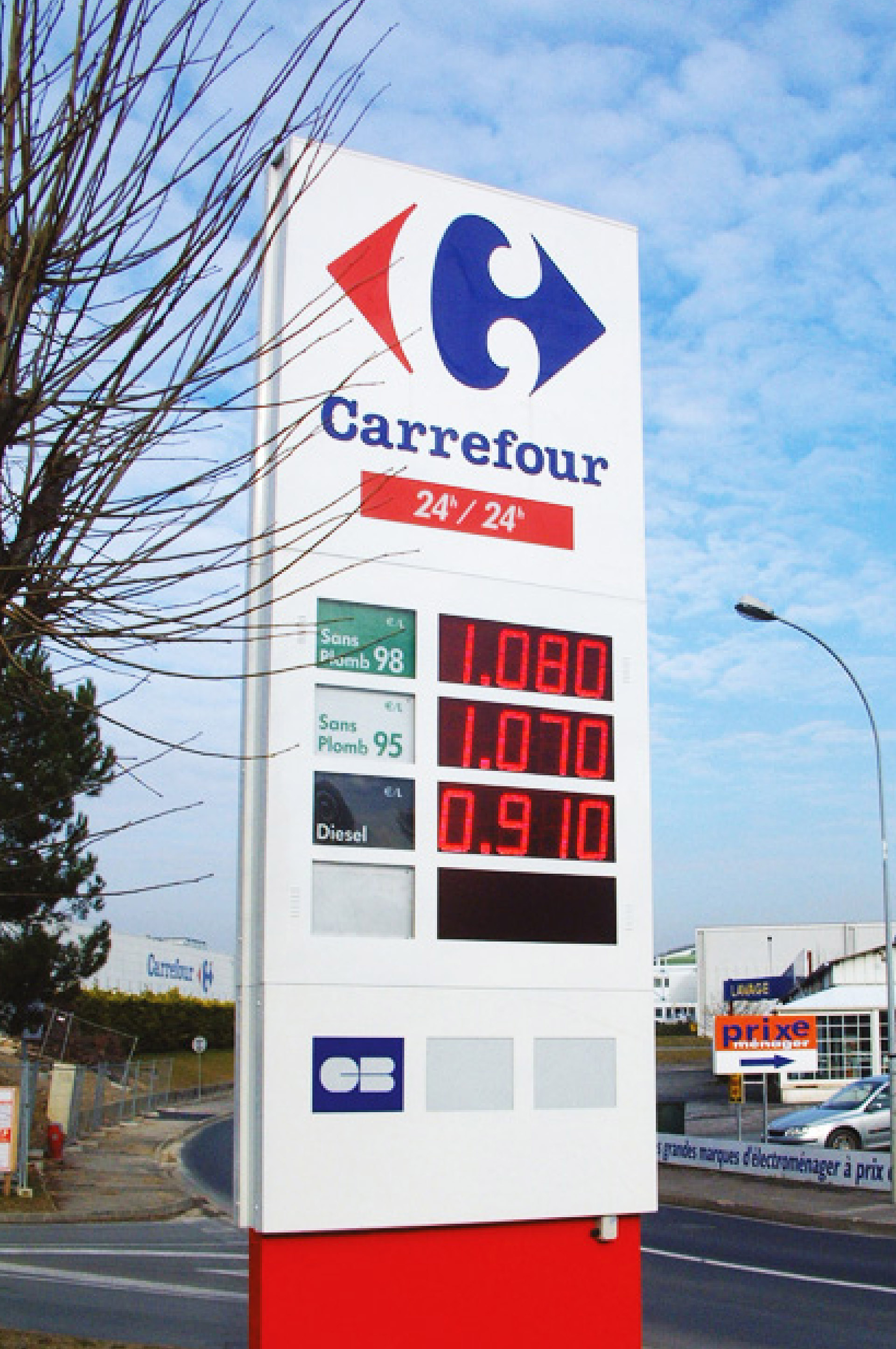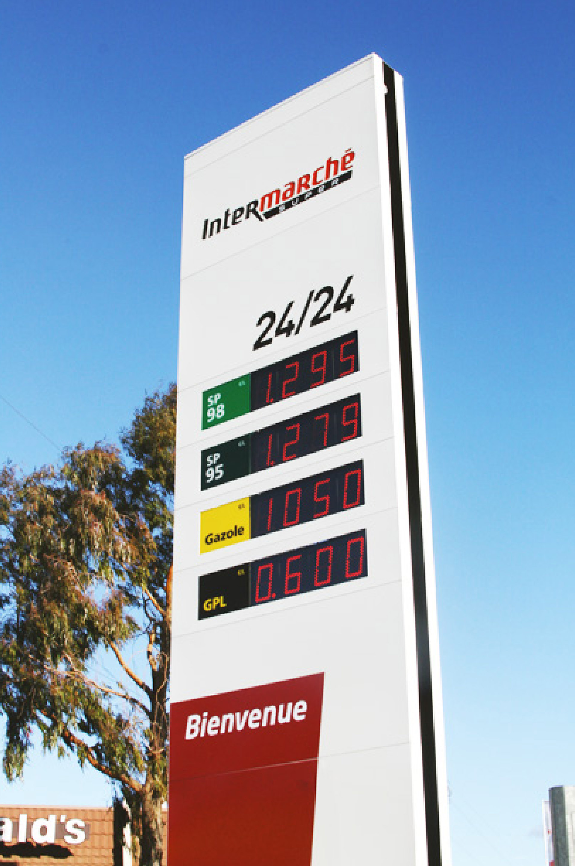 - Affichage électronique à diodes électroluminescentes, haute luminosité. Hauteur des chiffres afficheurs prix ; 150, 200, 250, 300 et 400 mm. Commande par liaison filaire ou radio, interfacée avec les protociles de commande de pompes. En option le totem peut être équipé d’un afficheur HDT (Heure, Date, Température). Couleur disponible : Ambre, Rouge, Blanc, Bleu.